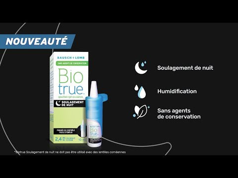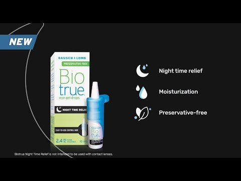 Say goodnight to dry eyes!Biotrue®Night Time Reliefcontains 2.4mg/ml (0.24%) of the clinically proven natural moisturizer hyaluronic acid (as sodium hyaluronate). It provides immediate, long-lasting hydration and delivers intensive moisturization for dry eyes. Helping to relieve symptoms of tired, stressed, burning, and teary eyes. Formulated to be used before bed, this product supports all layers of the natural tear film in our eyes, helping to provide long-lasting relief from dry eye discomfort while sleeping.