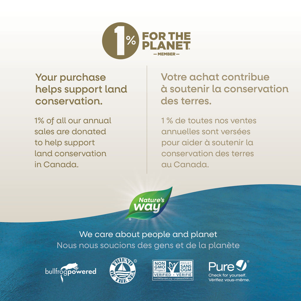 1% For The Planet: For over 50 years, Nature’s Way has turned to nature for inspiration and that connection drives our commitment to environmental responsibility. Every time you purchase a Nature’s Way Canada product, you are helping us protect the nature that inspires us all. As a proud member of 1% for the Planet, we contribute 1% percent of our annual sales to support environmental initiatives across Canada.