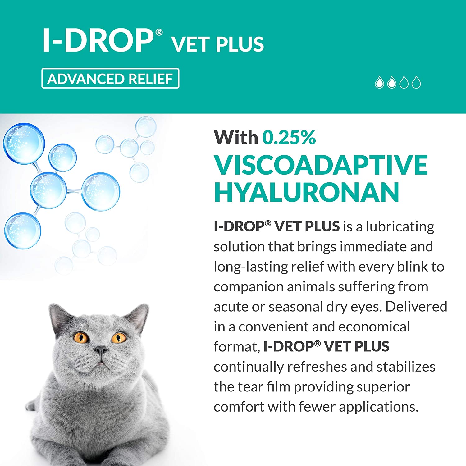 I-DROP® VET PLUS is a lubricating solution that brings immediate and lasting hydration and lubrication with every blink to companion animals suffering from acute or seasonal dry eyes.  Delivered in a convenient and economical format, I-DROP® VET PLUS continually refreshes and stabilizes the tear film providing superior comfort with fewer applications.